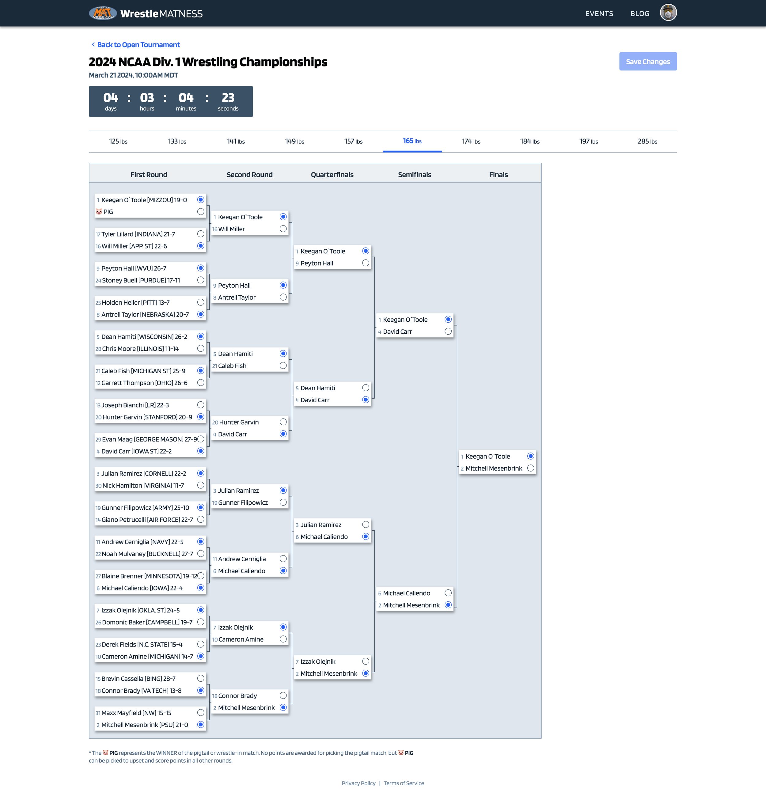 1st Round: Peyton Hall takes out “Best Name” Nominee Stoney Buell. This sets up a matchup with Antrell “Rolle” Taylor or Holden Heller. We have Caleb Fish (doesn’t wrestle like one) completing the UPSET over Garrett Thompson. Another notable name is Army’s Gunner Filipowicz taking out fellow serviceman Petrucelli. Cameron Amine survives late against a tough opponent in Derek Fields.