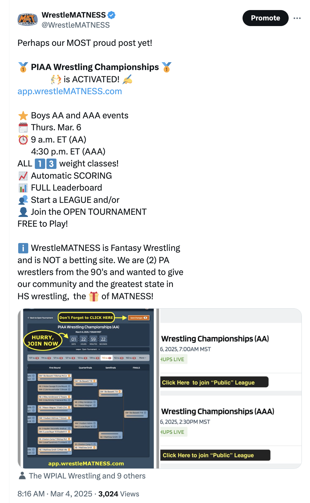 PIAA Wrestling Championships (AAA) Mar 5 Written By Clint Shafer WrestleMATNESS on X WATCH: PA Power Wrestling’s Preview and Breakdown (AAA brackets) Join the MATNESS Clint Shafer